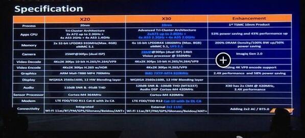 对比来看,Helio X30相比Helio X20性能提升43%,功耗降低53%,据称跑分可达16万分。在其他方面,Helio X30最高支持8GB的LPDDR4X运存,支持UFS 2.1储存芯片,双ISP最高支持2800万像素摄像头,3载波聚合、Cat.10LTE、802.11ac WiFi也统统支持。