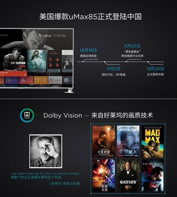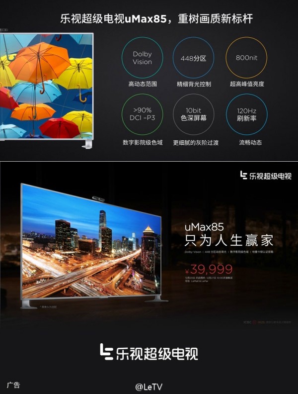 uMax85电视国内定价39999元(美版4999美元),LeMall、LePar已开始预约,12月27日10点开卖。