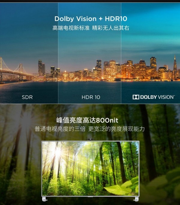 屏幕分辨率达3840×2160 4K超高清级别,刷新率120Hz,峰值亮度800nit,支持10-bit色深、HDR10高动态范围、杜比Vision、DCI-P3 90%色域,还有448个独立光源控制的背光分区、MEMC/Fluid Motion/120Hz HFR三种技术保障动态画面无拖影。
