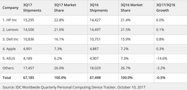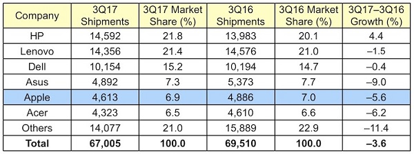 IDC发布的“2017年第三季度PC市场报告”数据略有不同。IDC的报告显示,今年第三季度全球PC出货量下降了0.5%,苹果出货量为490万台,同比增长0.3%。