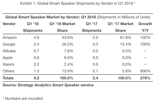Helen 2018-05-18 10:14根据市场调查机构 Strategy Analytics 披露的最新数据,在2018年第1季度亚马逊智能音箱设备全球出货量为400万台,而谷歌和苹果等一线科技企业的涌入让这个市场的竞争更加激烈。2018年第1季度全球智能音箱设备出货量为920万台,排名前五的分别为亚马逊、谷歌、阿里巴巴、苹果和小米。目前亚马逊的市场份额为43.6%,尽管出货量翻倍,但份额相比较去年同期的81.8%有明显下降。