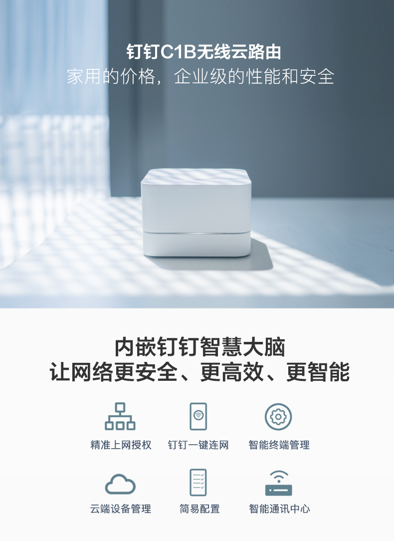 Helan 2018-12-10 09:2012月9日的钉钉超级发布会上,钉钉推出了多款新品,其中一款无线云路由,型号“C1B”。C1B无线云路由内部采用高通芯片,搭配128MB DRAM、128MB Flash,支持2x2 802.11ac Wi-Fi,2.4GHz、5GHz双频段最高速率分别为300Mbps、866Mbps,并搭配4根立式全向3dBi高增益天线。