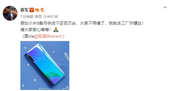 雷军在微博上表示:“假如小米9首月供货不足百万台,大家不用催了,我就去工厂拧螺丝!请大家耐心等等!”