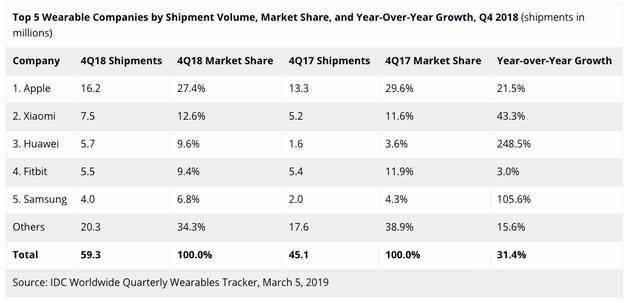 2018第四季度,可穿戴设备出货5930万部,这主要是受假日购物季前新推出的可穿戴设备和智能手机推动。苹果、小米、华为分列出货量前三。其中苹果第四季度出货量为1620万台,市场份额27.4%,高于上年同期的1330万台/29.6%的数据。当然,这看似强大的数据下也有隐忧,尽管苹果的出货量巨大,但它的市场份额是下滑的,这意味着苹果的市场份额正在被竞争对手蚕食。