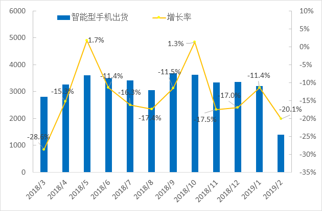 Andy 2019-03-12 10:39受整体手机市场需求下滑的影响,2018年智能型手机出货14.5亿台,较2017年下滑2.7%。2019年智能型手机出货依然未见好转,据中国信息通信研究院数据统计,1月智能手机出货量 3214.6 万部,同比下降11.4%,2月智能手机出货量 1398.9 万部,同比下降20.1%,主要受春节假期,以及首季淡季需求的影响。