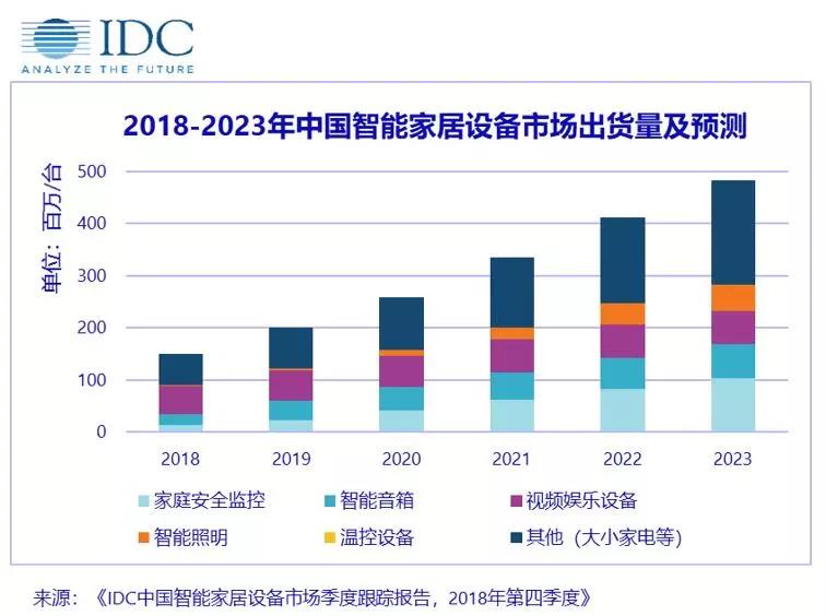 Andy 2019-03-28 10:18《IDC中国智能家居设备市场季度跟踪报告》显示,2018年中国智能家居市场累计出货近1.5亿台,同比增长36.7%。其中第四季度出货4610万台,同比增长45.4%。预计未来五年中国智能家居设备市场将持续快速增长,2023年市场规模将接近5亿台。
