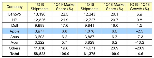 2019年Q1 PC出货量情况