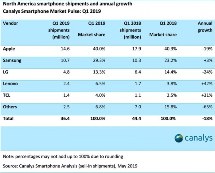 Olivia 2019-05-10 11:09据Canalys最新公布的最新智能手机出货量数据显示,2019年首季北美手机市场出货量整体下滑18%,创5年以来的最低水平,并创下有记录以来最大的单季同比降幅,原因之一是苹果公司iPhone智能手机的销售表现乏力。