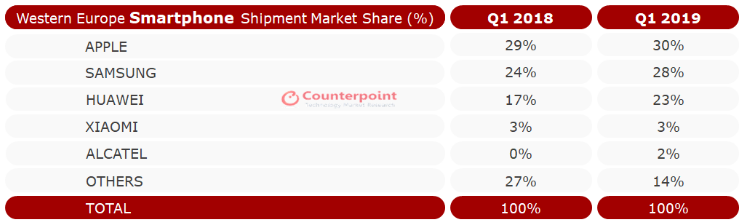 欧洲一季度智能手机市场:华为大幅增长70%份额逼近三星