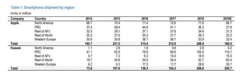 摩根大通在这份报告中也预测了华为和苹果今年智能手机出货量情况,苹果今年的出货量预计在1.8亿台左右,是近五年来最差的成绩,从2015年开始iPhone的年出货量都在2亿台以上。