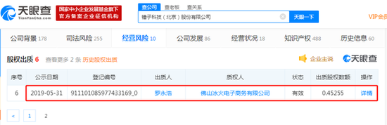 Olivia 2019-06-03 17:09天眼查数据显示,5月31日,锤子科技(北京)股份有限公司新增4条股权出质,出质人为罗永浩。公开数据显示,质权人分别为深圳市天河星供应链有限公司、北京猎户星空科技有限公司、上海维服信息技术有限公司以及佛山冰火电子商务有限公司,其中猎户星空是猎豹移动旗下人工智能子公司,最大股东为傅盛。