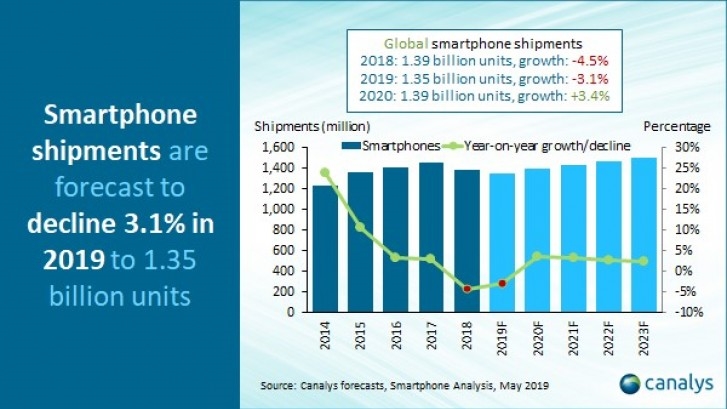 Canalys表示,2019年智能手机出货量将会同比下降3.1%,下跌至13.5亿部,而2018年智能手机出货量为13.9亿部。