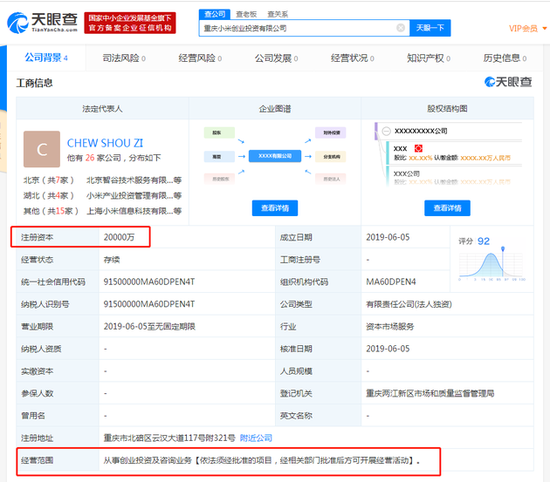 天眼查数据显示,6月5日,小米科技有限责任公司新增对外投资,成立重庆小米创业投资有限公司,注册资本2亿元。