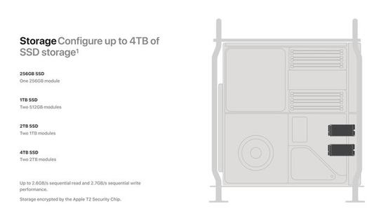 据悉,Mac Pro可选的存储方案共有四种,分别是256GB、1TB(2×512GB)、2TB(2×1TB)和4TB(2×2TB),标称性能方面,连续读取最高2.6GB/s、写入最高2.7GB/s,支持T2安全芯片加密。