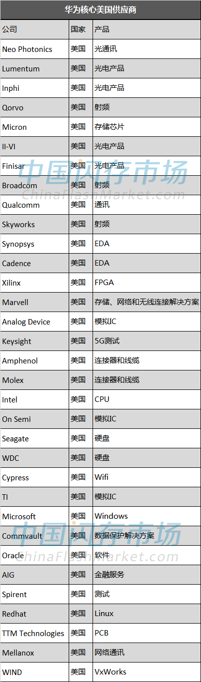 华为在2018年采购700亿美元的组件,其中约有110亿美元产品是来自美国公司,包括高通、英特尔和美光等。据中国闪存市场不完全统计,以下为2018年华为核心供应商中来自美国的厂商目录。