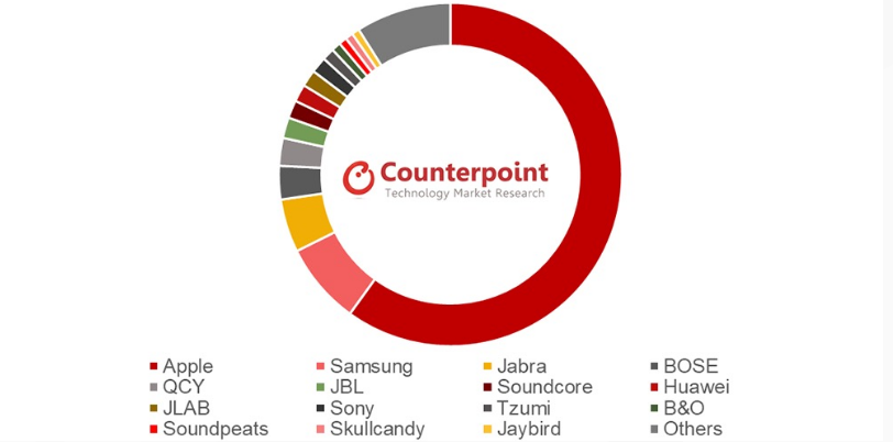 好消息是,苹果仍然统治真无线耳机市场。Counterpoint 并没有分享确切的数据信息,只是提供各品牌的市场份额对比图。目前,苹果已经拿下一半市场份额,简单的说真无线耳机市场上有两种产品:AirPods 和其他品牌。