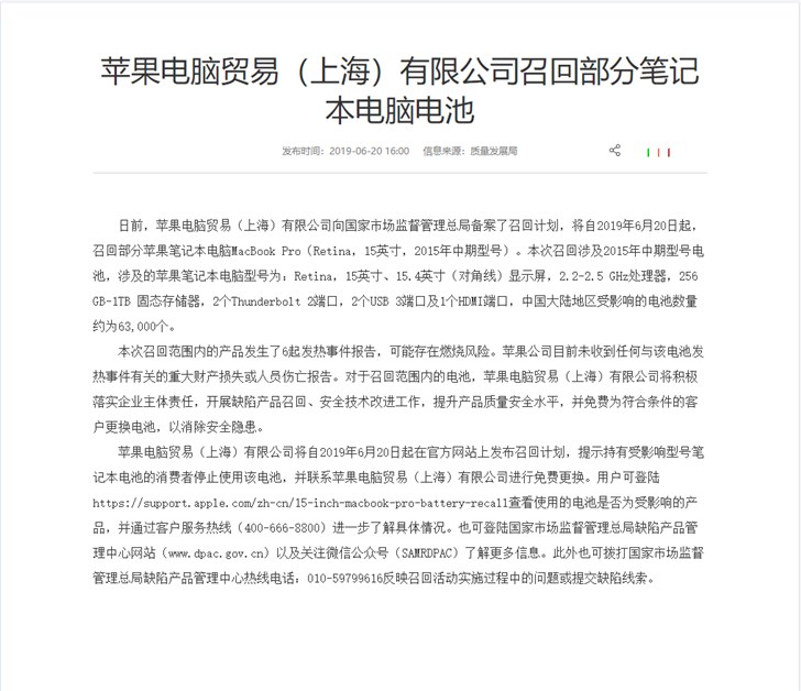 Olivia 2019-06-20 19:42据市场监管总局官网6月20日消息,日前,苹果电脑贸易(上海)有限公司向国家市场监督管理总局备案了召回计划,将自2019年6月20日起,召回部分苹果笔记本电脑MacBook Pro(Retina,15英寸,2015年中期型号)。