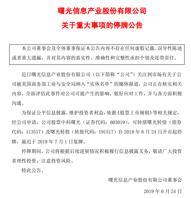 A股上市公司中科曙光发表声明,于6月24日起停牌,核实有关事项。