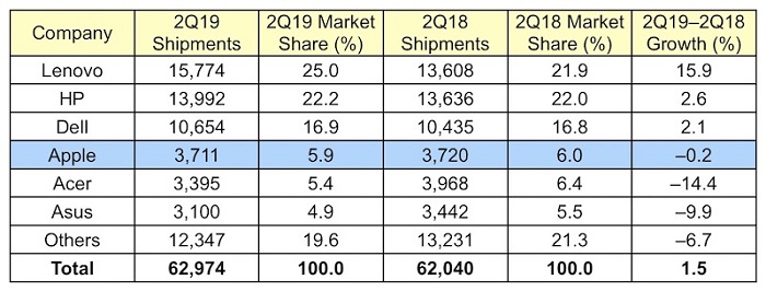 Olivia 2019-07-12 10:43Gartner发布初步数据显示,经过两个季度的下滑,2019年第二季度全球个人电脑市场同比增长1.5%。据悉,当季全球个人电脑出货量为6300万部,高于2018年第二季度的6200万部。其中联想以25%的出货量占比稳居榜首位置,惠普排名第二,市场份额为22%,戴尔以22%位列第三。苹果公司的个人电脑出货量小幅下滑,以约6%的市场份额位居第四。