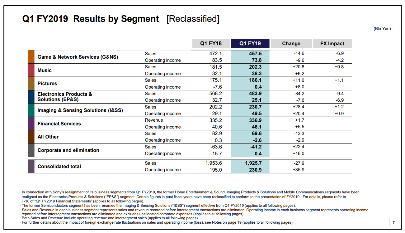 索尼2019财年第一季度总营收为1.93万亿日元,同比减少1%