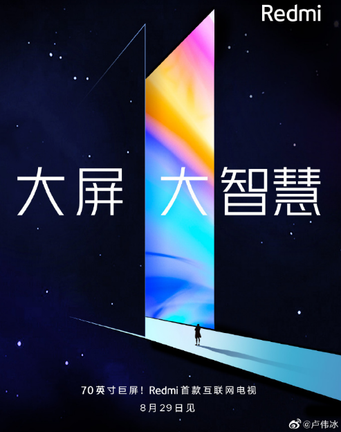 小米Redmi品牌总经理卢伟冰通过微博宣布,Redmi首款互联网电视采用70英寸巨屏,将于8月29日与大家见面。另外,“Redmi红米电视”官方微博已在8月16日经通过企业认证审核。