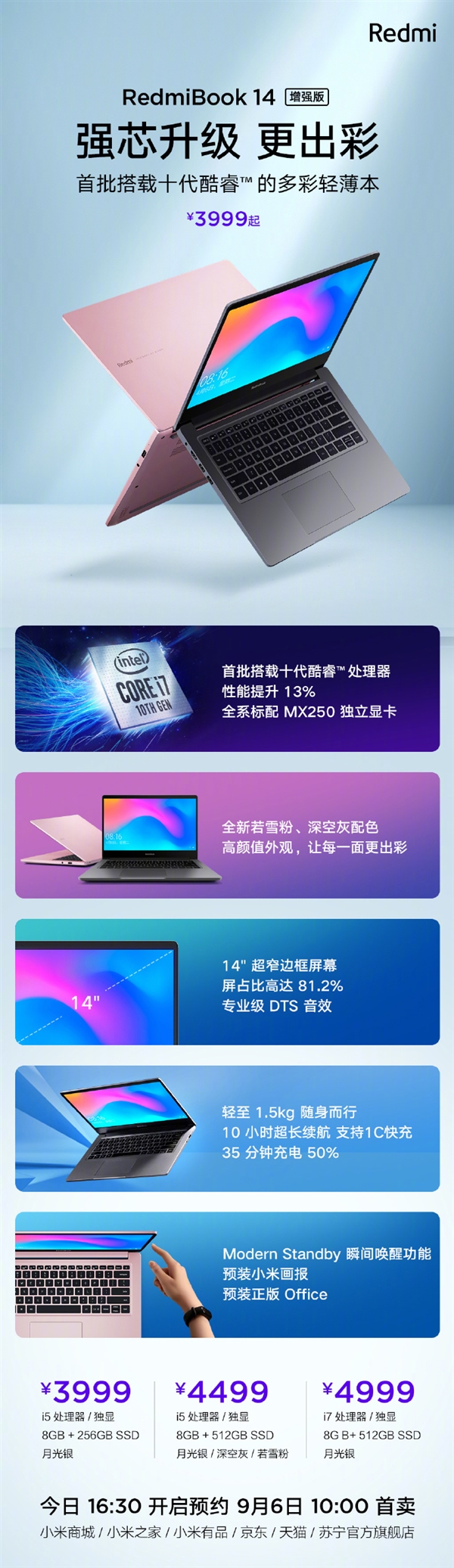 发售时间,RedmiBook增强版当日开始预约,9月6日10点在小米商城、小米之家、有品、小米京东/天猫/苏宁旗舰店等渠道首卖。