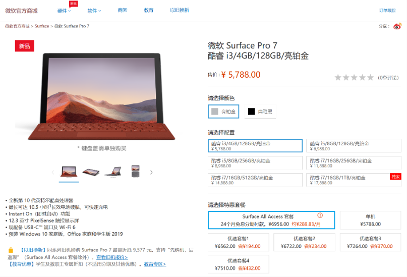 微软中国官网上架Surface Pro 7:4GB+128GB SSD