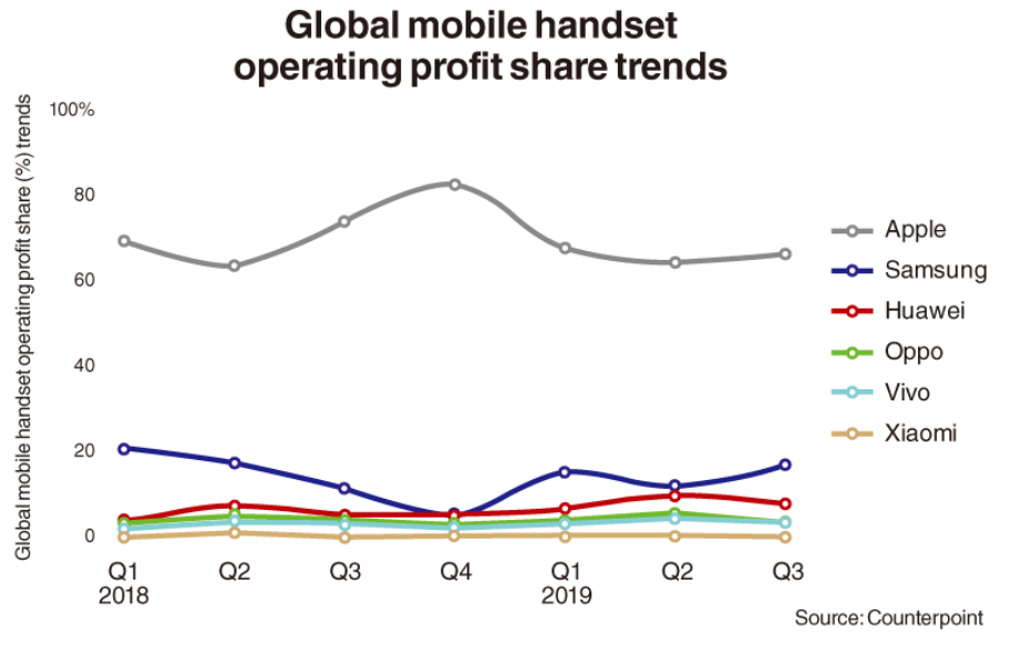 其中,苹果公司2018年第四季度利润占整个手机市场营业利润的80%,截至2019年第三季度,苹果以占行业利润66%的比例主导全球移动市场。