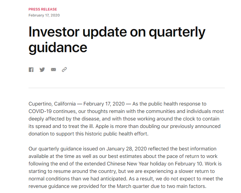 苹果表示:“于2020年1月28日发布的季度指引反映了当时可以获得的最佳信息,以及我们对2月10日春节长假结束后(中国)复工速度的最佳估测。全国各地正在开始复工,但恢复正常状况的速度比我们预期的要慢。因此,鉴于两个主要因素,我们预计无法实现此前为截至3月份的这个财季提供的营收指引。”这两大因素分别是全球iPhone供应受限,以及中国用户对苹果公司的产品需求下降。