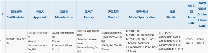 AVA 2020-02-20 10:40日前,型号为M2001J11E、M2001J11C的小米5G数字移动电话机通过3C认证,由小米通讯技术有限公司作为申请人与制造商,首次发证日期为2月19日,配备最高33W输出的电源适配器。业界推测该款手机或为即将推出的Redmi K30 Pro。
