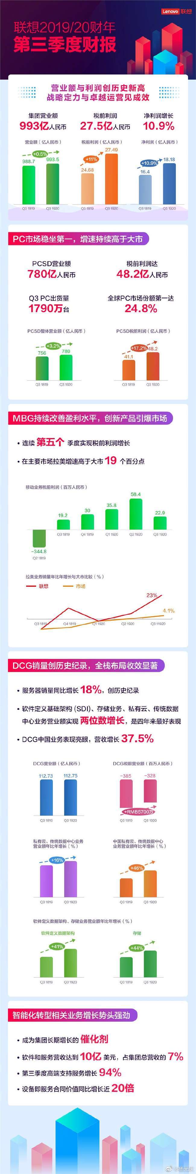 AVA 2020-02-20 15:162月20日,联想集团公布截至2019年12月31日的19/20财年第三财季业绩。本季度,联想营收与税前利润再创历史新高:营收达993亿人民币,连续10个季度增长;税前利润实现27.5亿人民币,同比增长超过11%。