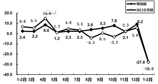 2020年1-2月以来计算机制造业增加值和出口交货值分月增速(%)