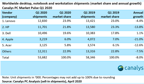 Canalys最新报告数据显示,2020年第一季度PC(包括台式机、笔记本电脑和专业工作站)出货量为5368万台,与2019年同期5835万台的数据相比,下降了8%,这是自2016年以来的最大跌幅。