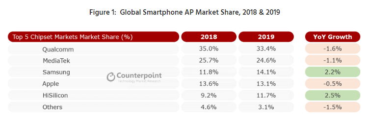 Olivia 2020-04-15 11:46据Counterpoint Research的最新季度手机报告,三星和海思(华为)是前五名智能手机应用处理器(AP)制造商中唯一在2019年看到正增长的供应商,苹果高通都出现了不同程度的下滑。
