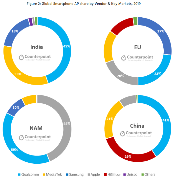 尽管全年下降1.6%,但高通仍然保持稳固的头把交椅,2019年占智能手机AP出货量的三分之一。在中东和非洲(MEA)以外的所有市场中,高通的份额均超过30%,与其他市场相比,高端智能手机的较低需求抑制了对高通芯片组的需求。