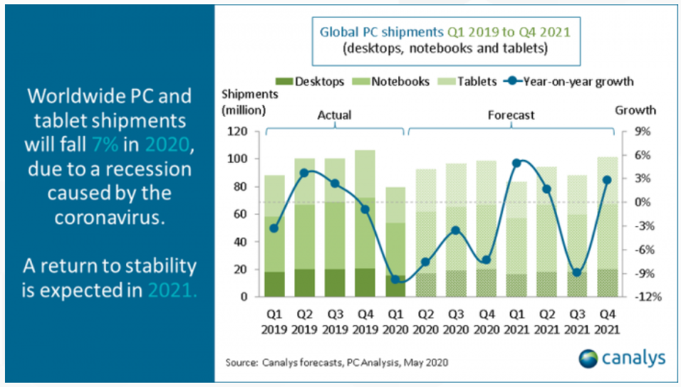 Andy 2020-06-03 09:46市调机构Canalys公布最新研究显示,由于疫情的影响,2020年全球PC(含平板电脑)出货量将下降7%。并表示,全球个人电脑市场将在2021年保持平稳,并在2022年恢复2%的增长。