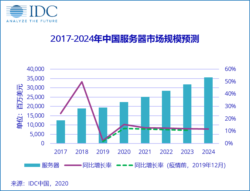 新冠肺炎疫情的爆发促使许多企业的业务由线下转为线上,对中国整体服务器市场产生了积极的促进作用,加速了行业用户对于中国服务器市场的需求。相较疫情前(2019年12月)对于2020-2024年的同比增长率,最新发布的服务器市场预测数据显示,2020年中国服务器市场规模预计同比增长15.6%,高于疫情前的12.4%;而2021至2024年每年的同比增长率均高于疫情前的增速。